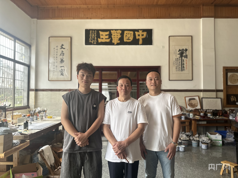 周鹏程的儿子周晨旭(右)和孙子周宏骏(左)也在传承毛笔制作技艺(央广网发 记者韩雪莹 摄)