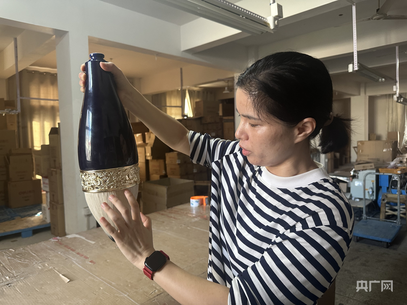 张译文展示酒业品牌定制文创产品中的巨型笔头(央广网发 记者韩雪莹 摄)